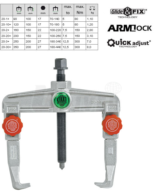 2-ramenné stahováky s posuvnými háky se systémem Quick adjust (rychle se nastavující háky) německé firmy KUKKO-Werkzeugfabrik patří do nejvyšší kvalitativní třídy v Evropě.Vlastnosti: