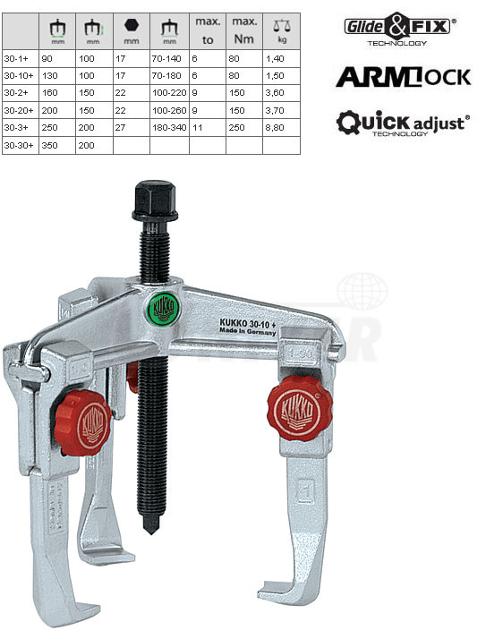 3-ramenné stahováky s posuvnými háky se systémem Quick adjust (rychle se nastavující háky) německé firmy KUKKO-Werkzeugfabrik patří do nejvyšší kvalitativní třídy v Evropě.Vlastnosti: