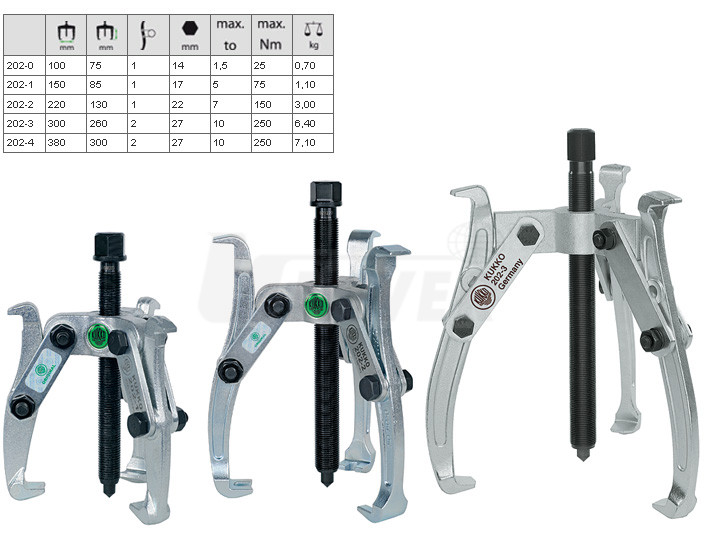 - robustní univerzální provedení pro stahování řemenic, ozubených kol, kuličkových ložisek a podobných dílů.