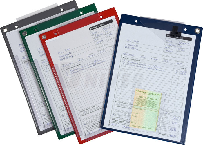 - průhledná přední fólie s vysokou pevností a mechanickou odolností je na dvou stranách otevřená, což usnadňuje vložení zakázkového listu nebo jiných dokumentů, a doplněná ve spodní části malou průhlednou kapsičkou (např. pro Osvědčení o registraci vozidla)