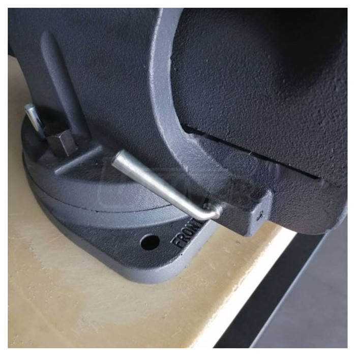Otočný dílenský svěrák masivní konstrukce s šířkou upínacích čelistí 205 mm, se spodním upínáním pro trubky do průměru 75 mm a s velkou kovadlinou v zadní části.- otočná základna se 3 upevňovacími šrouby