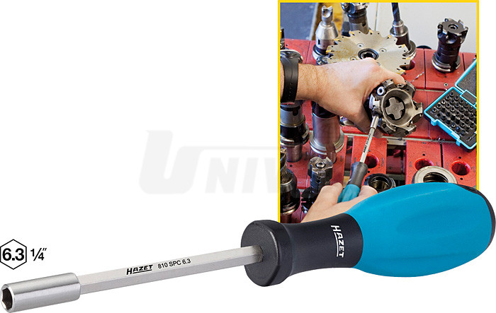 Držák 1/4" na nejrůznější bity. Má šestihrannou hlavici 1/4"=6,3 mm, s magnetem. Celková délka držáku s ergonomickým tříkomponentním držadlem a matově chromovaným povrchem činí 210 mm, z toho držadlo 110 mm.