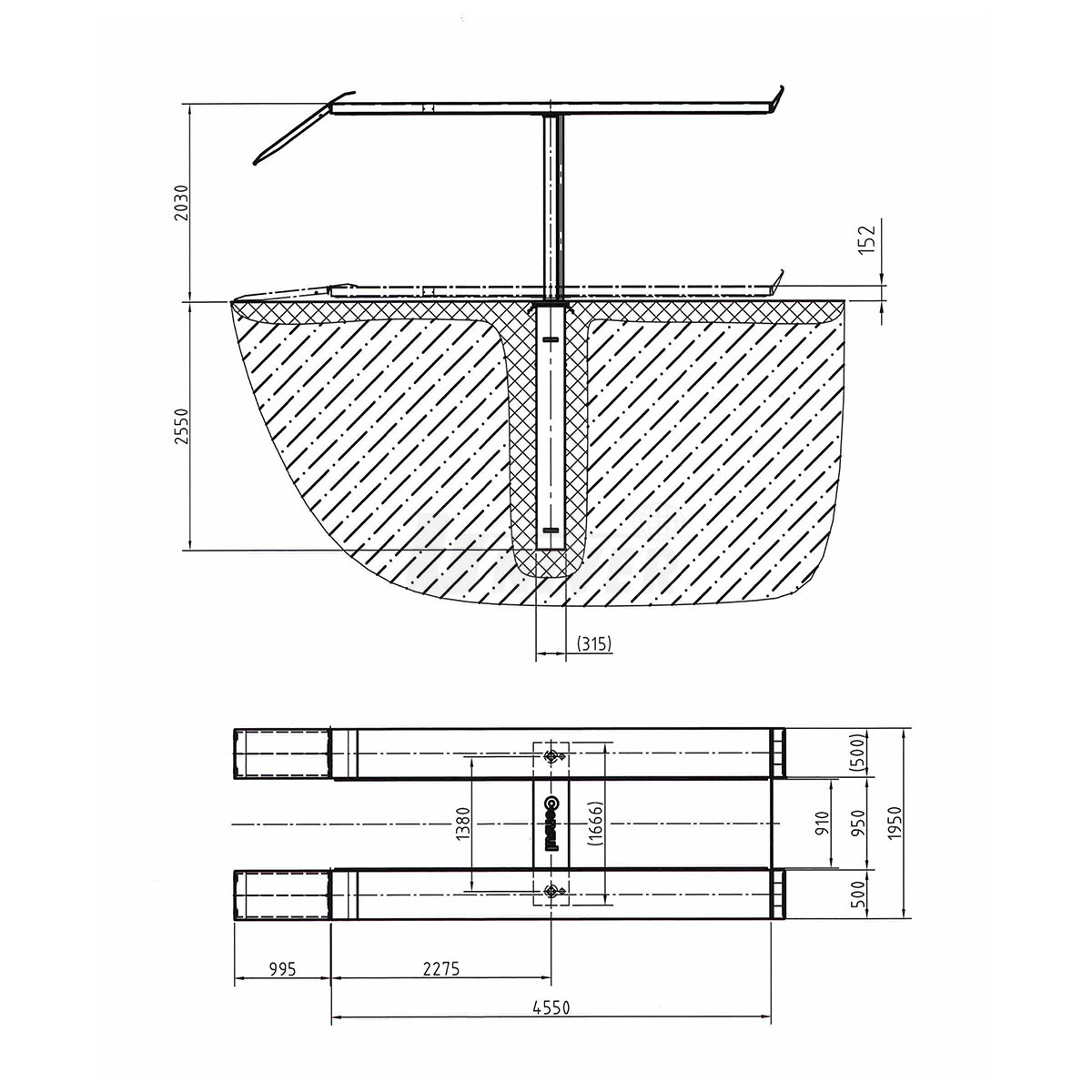 Dvoupístový hydraulický podpodlažní zvedák s nosností 3,5 t, se 2 plošinami dl. 4550 mm, šířky 500 mm, vzdáleností mezi plošinami 950 mm a se vzdáleností pístních jednotek 1380 mm.- vodicí i opěrný píst tvrdě pochromované