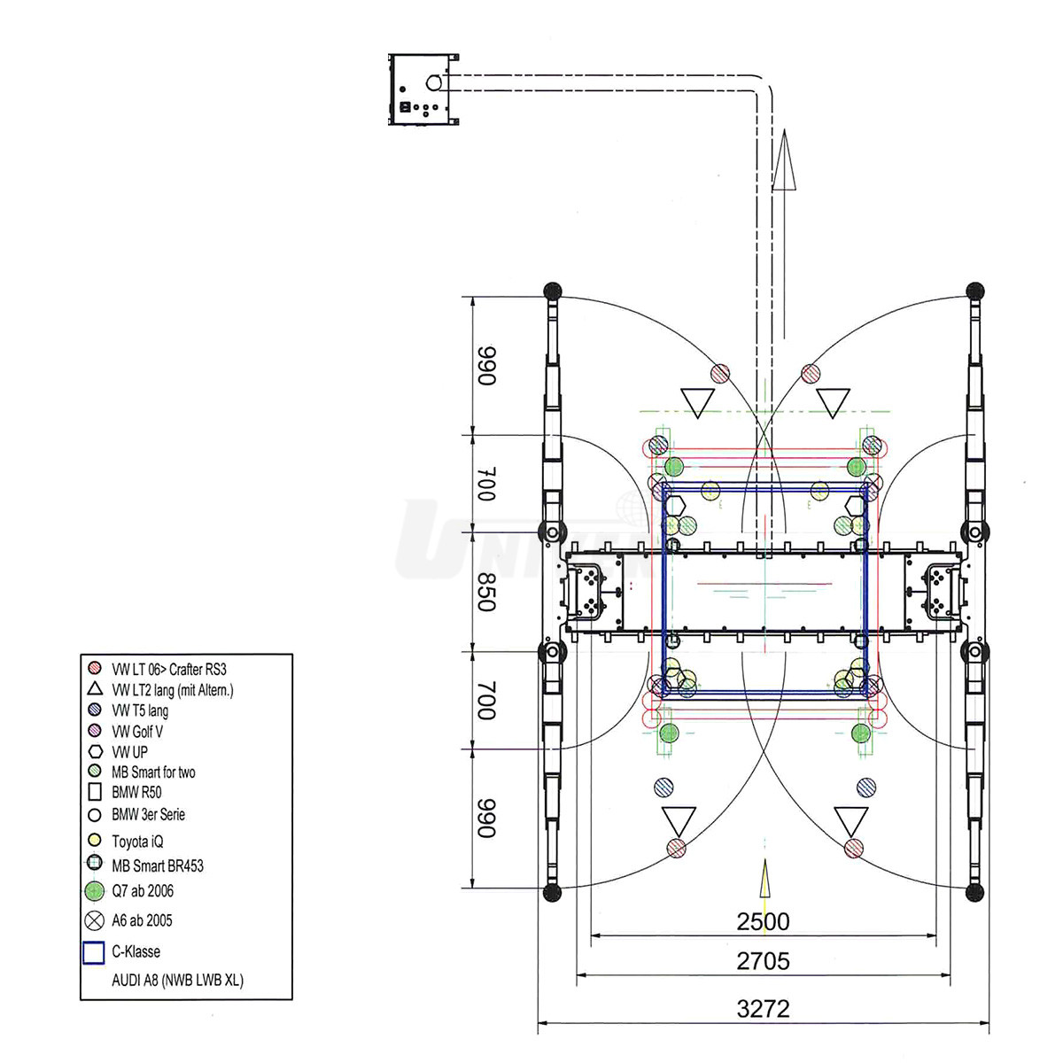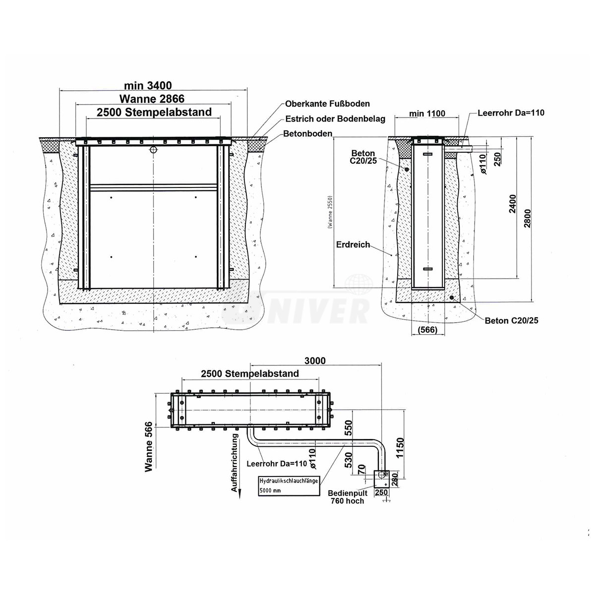 Dvoupístový hydraulický podpodlažní zvedák s nosností 5,5 t, se vzdáleností pístních jednotek 2500 mm, s volitelnou horní nosnou částí se 4-dílnými otočnými a délkově nastavitelnými nosnými rameny.- vodicí i opěrný píst tvrdě pochromované