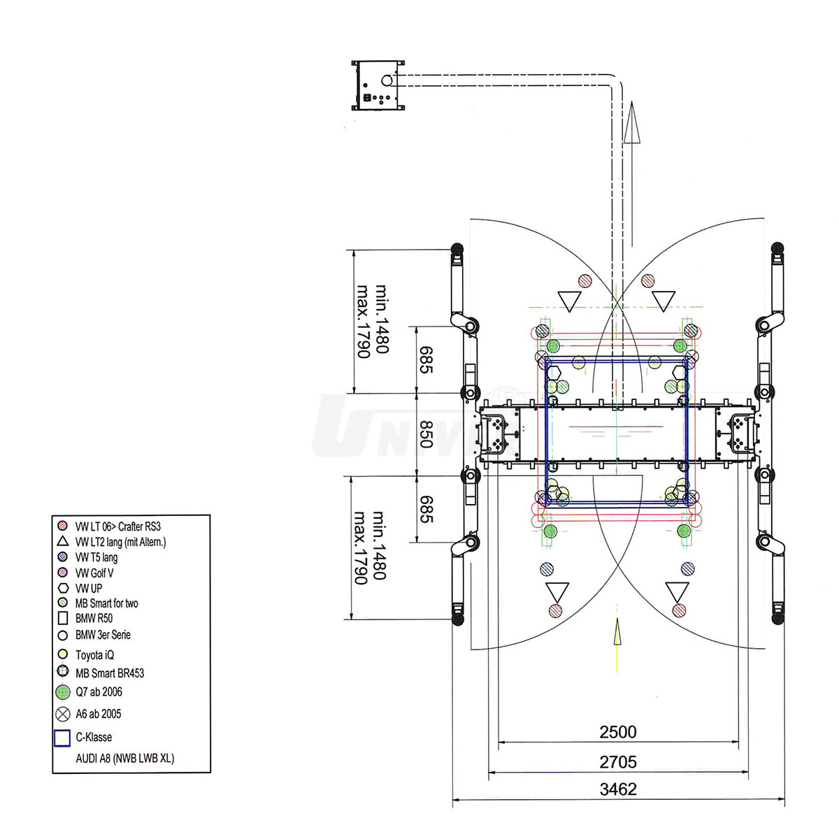 Nosnost 5,5 t, výška zdvihu cca 2185 mm, spodní výkyvná výška cca 120 mm, rozsah nosných ramen cca 795 – 1790 mm.