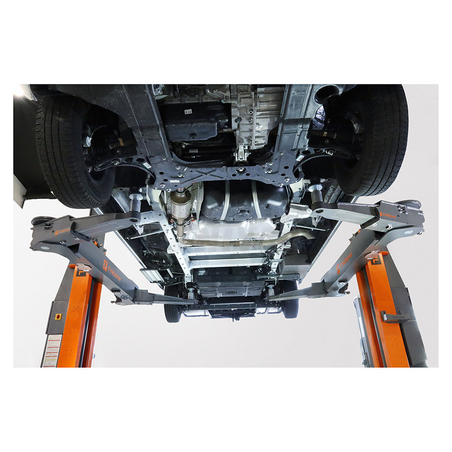 Dvousloupový elektrohydraulický zvedák se symetrickými nosnými rameny s nosností 7500 kg v robustním tzv. bezprahovém provedení.- dvousloupový elektrohydraulický bezprahový zvedák se symetrickými rameny s nosností 7500 kg pro zvedání osobních a menších užitkových automobilů