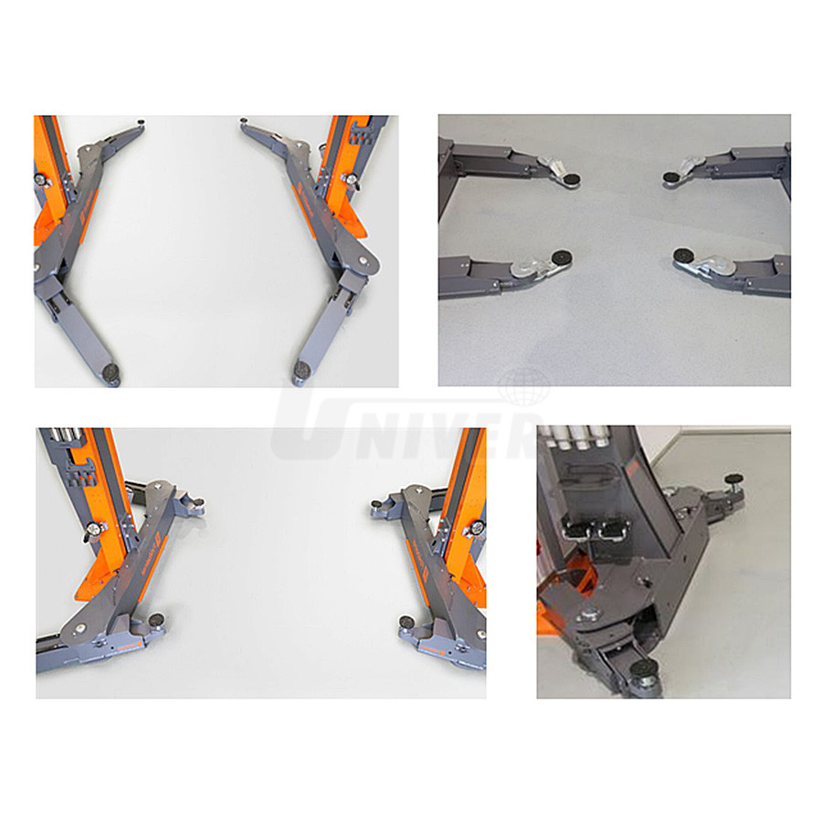 - dlouhá nosná ramena, patentově chráněná, jsou teleskopická s válečkovými ložisky a lze je kompaktně zasunout do sebe, takže nezabírají mnoho místa