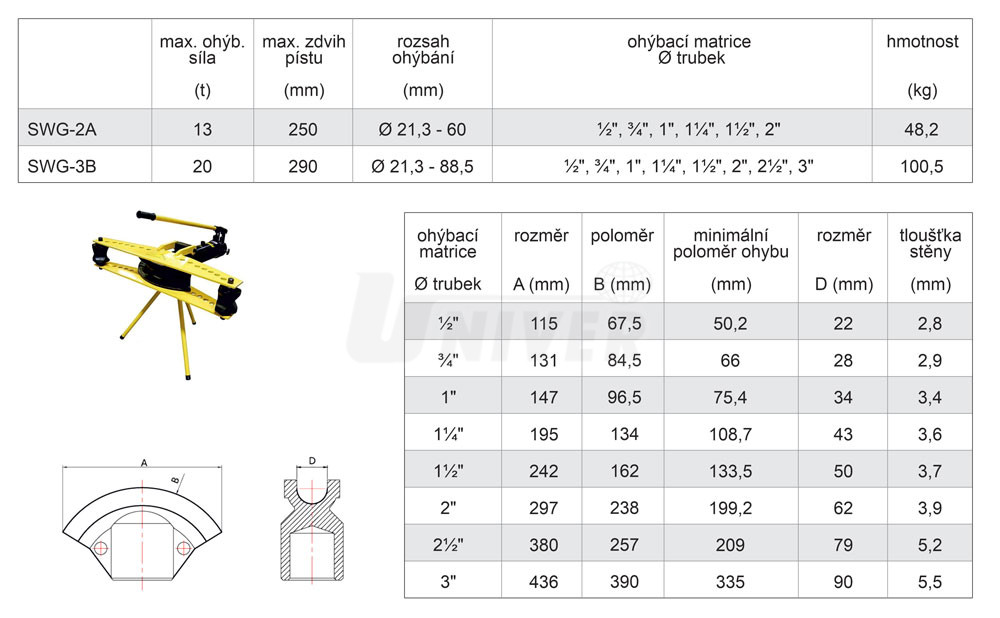 Přenosná hydraulická ohýbačka ocelových trubek a trubek z barevných kovů o průměru 1/2", 3/4", 1", 1-1/4", 1-1/2", 2", 2-1/2", 3" má stojan a vyznačuje se tuhou konstrukcí, ohýbací silou 20 t a úhlem ohybu až 90°.- pro ohýbání trubek z běžné oceli, nerezových trubek, trubek z barevných kovů apod.