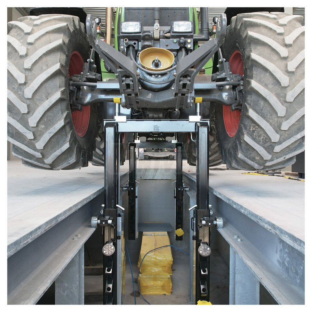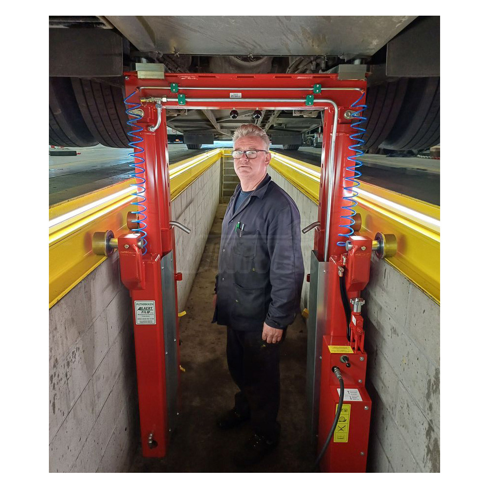 Jamový zdvihák (pneumaticko-hydraulický) zavesený portálový, s nastaviteľným priečnym nosníkom, s plne automatickou prevádzkou, s nosnosťou 20 t, so zdvihom 750 mm.- zavesený portálový jamový zdvihák ponúka výhody ergonomického podlahového zdviháka, vďaka výsuvnej hornej časti je možné zdvíhať takmer všetky vozidlá aj s nízkou konštrukčnou výškou