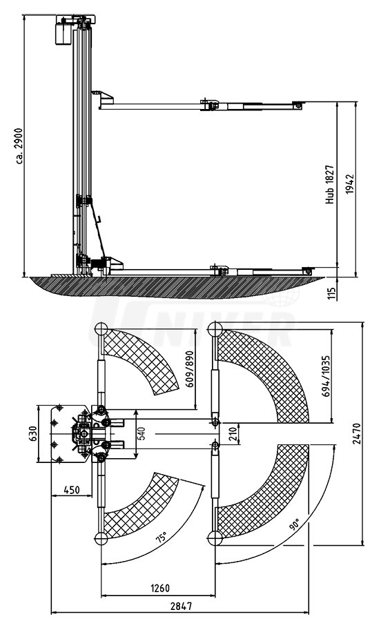 Jednosloupový elektromechanický zvedák s nosností 2500 kg se používá také jako autokarosářský, a tam, kde jsou omezené prostory.- bez základového rámu