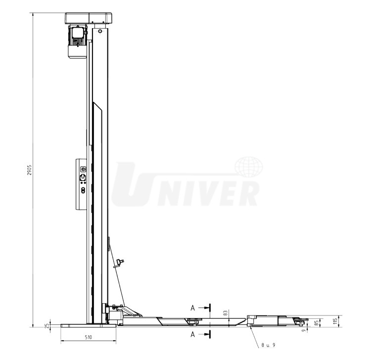 Jednosloupový elektromechanický zvedák s nosností 3000 kg se používá také jako autokarosářský, a tam, kde jsou omezené prostory.- bez základového rámu