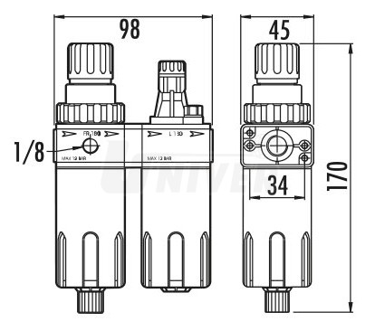 1800 l / min (min. 6 bar) 12 bar 0,5 až 10 bar max. 60°C (při max. tlaku) 10 µ 1 kapička každých 300 – 600 l / min 2 x 1/4" vnitřní závit 98 x 45 x 170 mm 512 g |