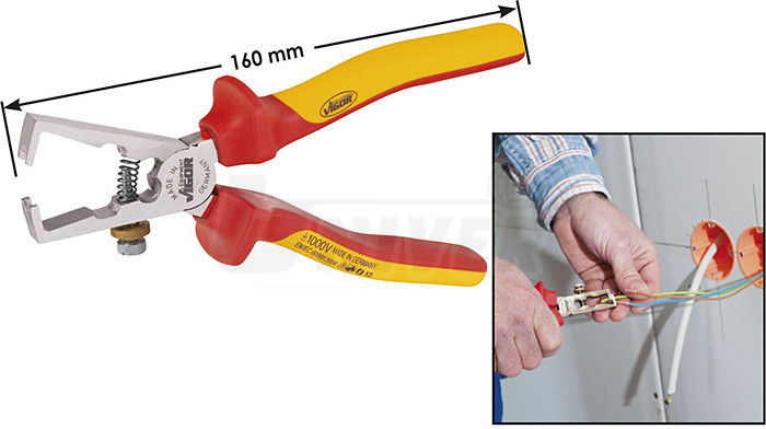 Kleště pro odizolování elektrických vodičů pro elektrikáře jsou z vysoce kvalitní speciální oceli. Mají dvou-komponentní ergonomické rukojeti, což umožňuje vysoký přenos síly na čelisti. Samozřejmostí je perfektně vyrobený kloub s velmi úzkou tolerancí rozměru otvoru pro čep. Nastavení kleští na požadovaný průměr vodiče dráty se snadno provádí pomocí nastavovacího šroubku. Otevření kleští napomáhá pružina. Povrch kleští - leštěný chrom. Délka 160 mm. Kleště se speciálními čelistmi pro odizolování elektrických vodičů až do průřezu 6 mm2 jsou zkoušeny při napětí 10 000 V. Umožňují bezpečnou práci až do napětí 1000 V (EN/IEC 60900:2004).