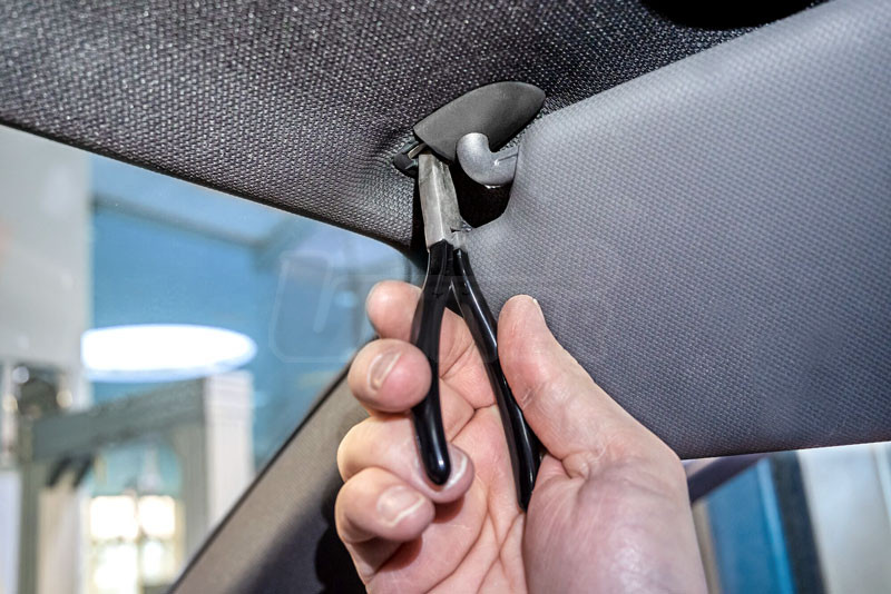 Kleště s obzvláště plochým tvarem pro použití ve zúžených konstrukčních prostorech, např. pro demontáž a seřízení držáků ve vnitřním prostoru, jakož i slunečních clon u vozidel koncernu Volkswagen.
