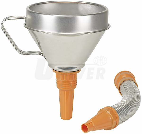 Kvalitní trychtýře z bílého plechu s vyšším límcem, ergonomickým držadlem a našroubovatelným bezpečnostním kovovým pružným výtokovým nástavcem s plastovou koncovkou. Dobře odolávají olejům, kyselinám, pohonným hmotám, příp. prasknutí. Mají vyměnitelné mosazné jemné vnitřní sítko (01 172).Použití: díky vysokému průtočnému množství - průmysl, opravárenství, řemeslná výroba, dílny apod.