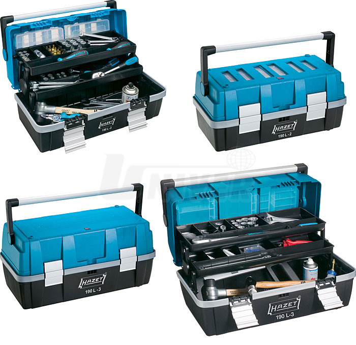 Plastové kufříky na nářadí v obzvláště robustním, odolném provedení. Mají aluminiové držadlo a uzavírací elementy.Typ HAZET 190L-2 má 2 odmímatelné boxy pro malé díly ve vnitřním víku a rozměry 215 x 470 x 250 mm.