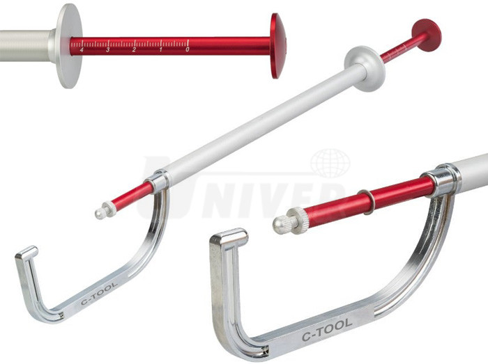 Měřidlo brzdových kotoučů v rozsahu 0 až 45 mm umožňuje měření bez nutnosti demontáže kol.- mechanické měřidlo tloušťky brzdových kotoučů