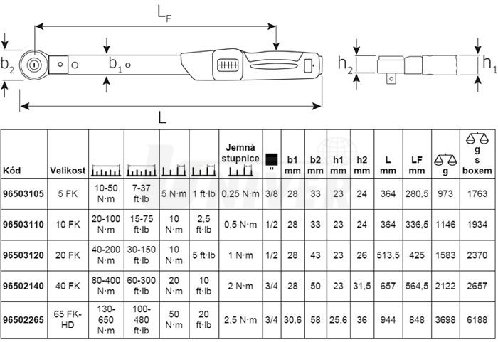 Momentové klíče (3/8", 1/2", 3/4") mají pevně zabudovanou ráčnu s jemným ozubením.Dodávají se ve stabilním plastovém kufříku (typ 96 50 22 65 ve skříňce z ocelového plechu).
