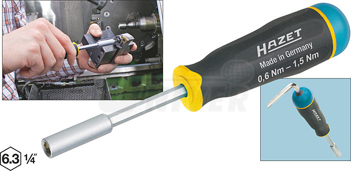 Momentový šroubovák nejvyšší kvality určený pro utahovací momenty od 1,5 Nm až do 3 Nm.Rychlé a precizní nastavení hodnoty utahovacího momentu se provádí pomocí úhlového imbusového šroubováku HAZET 2100-06 (6 mm, délka 96 mm, délka do pravého úhlu zahnuté části 38 mm), který se dodává s tímto momentovým šroubovákem. Při dosažení zvoleného utahovacího momentu dojde k uvolnění šroubováku doprovázeného charakteristickým pocitem i zvukem. Povolování je neomezené.