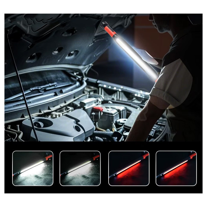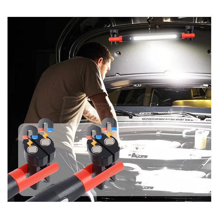 Dielenská montážna lampa trubicového prevedenia s postrannými magnetickými otočnými držiakmi a uchytávacími háčikmi.- praktická dielenská montážna lampa trubicového prevedenia s dĺžkou 520 mm