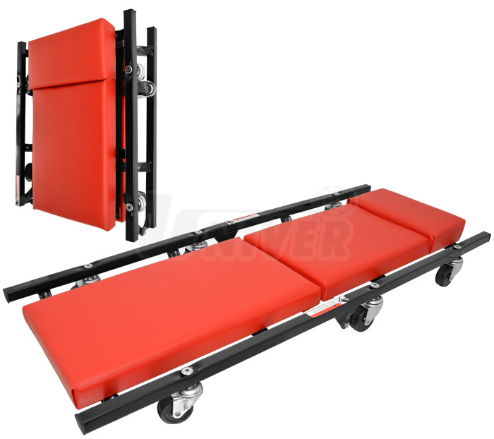 Skládací pojízdné montážní lehátko s vinylovým čalouněním, se 6 otočnými nylonovými kolečky v kuličkových ložiskách a s masivním kovovým rámem má rozměry 920 x 380 x 95 mm.- praktické skládací pojízdné montážní lehátko, umožňující pohyb např. pod stojícím nebo jen mírně nadzvednutým vozidlem ve výšce jen cca 10 cm nad podlahou