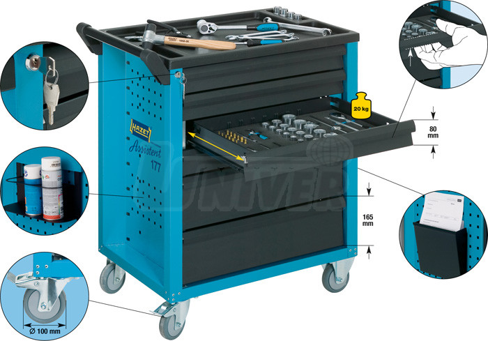 Pojízdné montážní vozíky z kvalitního ocelového plechu mají oboustranně na kuličkových ložiscích výsuvné zásuvky. Zásuvky s nosností 20 kg na zásuvku, celkové dovolené zatížení 300 kg, vrchní pracovní deska s odolnou plastovou povrchovou úpravou, 4 větší kolečka s tvrzenou pryží (2 říditelná s brzdou), umožňující snadné přejíždění nerovností, centrální zamykání, vypalovaný lak a mnoho možností pro upevnění příslušenství (např. koš na papíry, držák sprejů, samonavíjecí buben s kabelem atd.).Montážní vozík HAZET 177-6 Assistent má 4 nižší a 2 vyšší zásuvky.