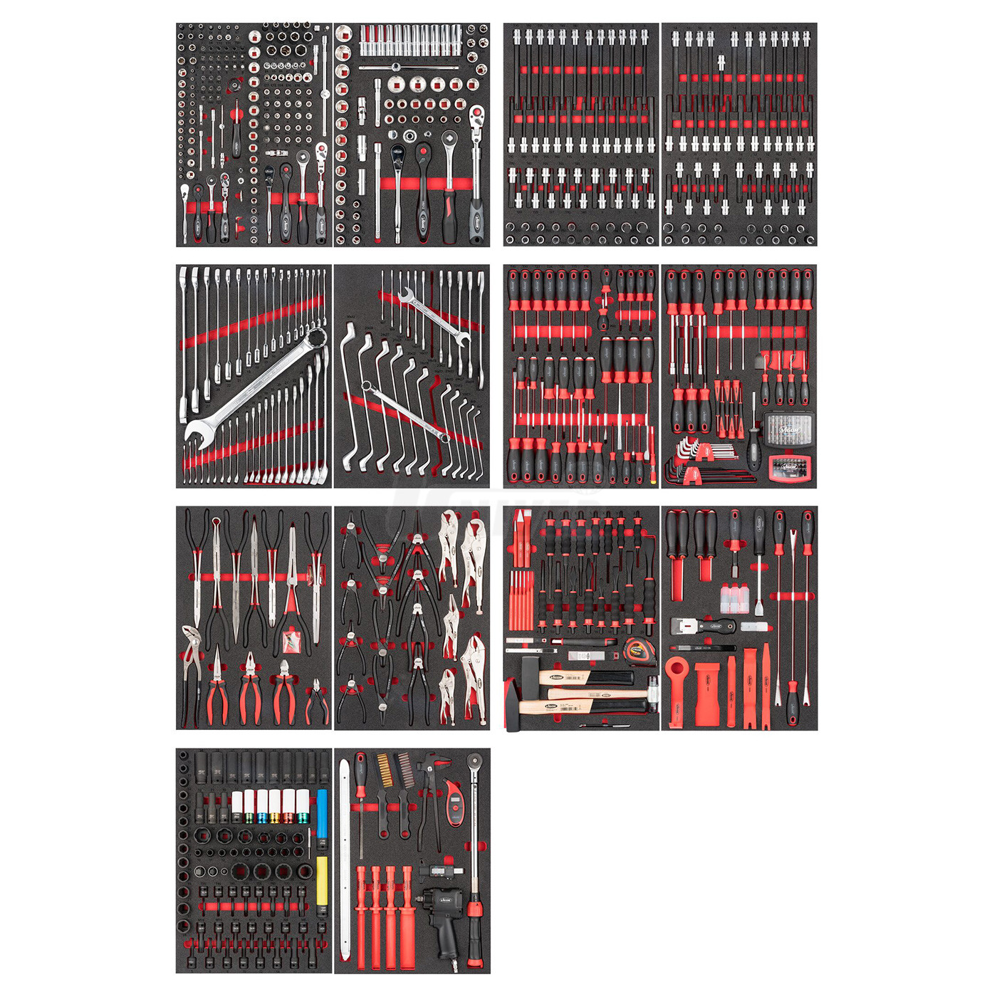 Montážní vozík se 775-dílnou sadou ručního nářadí rozdělenou do 14 modulů má 8 zásuvek (1 vysokou a 7 nízkých) a nerezovou pracovní desku.- 14 modulů (VIGOR V6821 / V6822 / V6807 / V 6808 / V6809 / V6810 / V6811 / V6812 / V6813 / V6814 / V6815 / V6816 / V6817 / V6818) s ručním nářadím (775 ks), jde o sady ráčen, nástrčných klíčů a bitů 1/4", 3/8" a 1/2" / 4 až 32 mm, otevřených, očkoplochých a vyhnutých očkových klíčů (6 až 36 mm), šroubováků, kleští, sekáčů, vyrážečů, ale také o kladivo, ocelovou palici, momentový klíč, pneumatický utahovák atd.