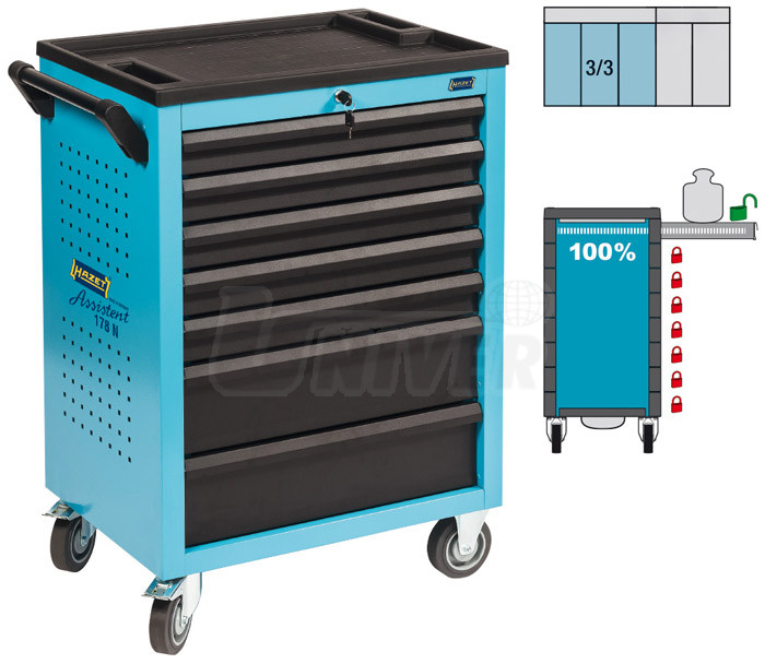 Montážní / dílenský vozík z kvalitního ocelového plechu má 7 stoprocentně výsuvných zásuvek s válečkovým vedením a centrální zamykání.- stabilní, robustní vozík z vysoce kvalitního ocelového plechu pro uložení nářadí a materiálu