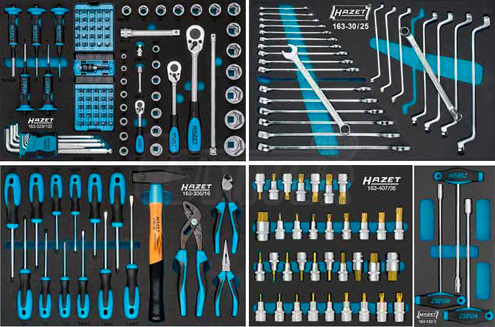 1. modul HAZET 163-329/100 (sada ráčen, nástrčných hlavic, vyrážečů a bitů – 1/2" a 1/4") sada vyrážečů 751HS/5