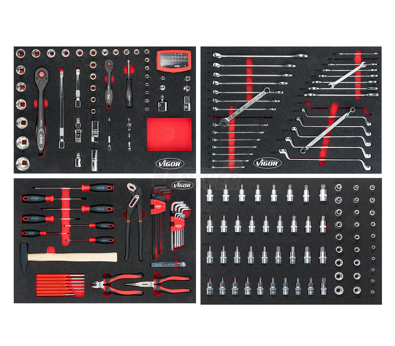 Montážní / dílenský vozík s 228-dílnou sadou ručního nářadí rozdělenou do 4 velkých modulů má 7 zásuvek (2 vysoké a 5 nízkých).- 4 moduly (VIGOR V5115 / V6726 / V5111 / V2837) s ručním nářadím (228 ks), jde o sady ráčen, nástrčných klíčů a bitů 1/4", 3/8" a 1/2" / 4 až 32 mm, otevřených, očkoplochých a vyhnutých očkových klíčů (6 až 22 mm), šroubováků, kleští, sekáčů, vyrážečů, ale také o kladivo atd.