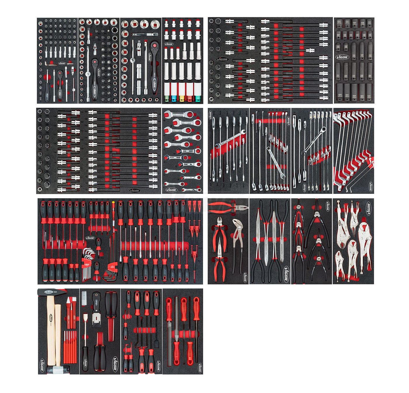 Montážní vozík s 499-dílnou sadou ručního nářadí rozdělenou do 21 modulů má 8 zásuvek (1 vysokou a 7 nízkých) a nerezovou pracovní desku.- 21 modulů (VIGOR V4971 / V4973 / V4975 / V7323 / V4727 / V5602 / V5006 / V5017 / V5070 / V5072 / V4979 / V4985 / V4987 / V4981 / V5170 / V4729 / V5075 / V5633 / V4995 / V4999 / V5004) s ručním nářadím (499 ks), jde o sady ráčen, nástrčných klíčů a bitů 1/4", 3/8" a 1/2" / 4 až 32 mm, otevřených, očkoplochých a vyhnutých očkových klíčů (6 až 36 mm), šroubováků, kleští, sekáčů, vyrážečů, ale také o kladivo, ocelovou palici atd.