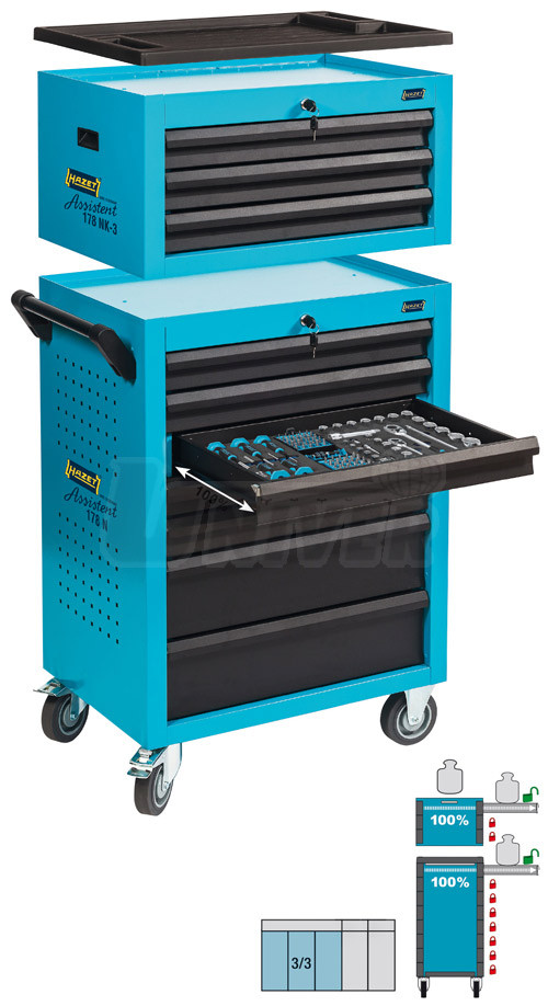 Sestavu tvoří montážní / dílenský vozík HAZET 178N-7 Assistent a nástavbový box HAZET 178NK-3 se třemi zásuvkami.- stabilní, robustní vozík z vysoce kvalitního ocelového plechu pro uložení nářadí a materiálu