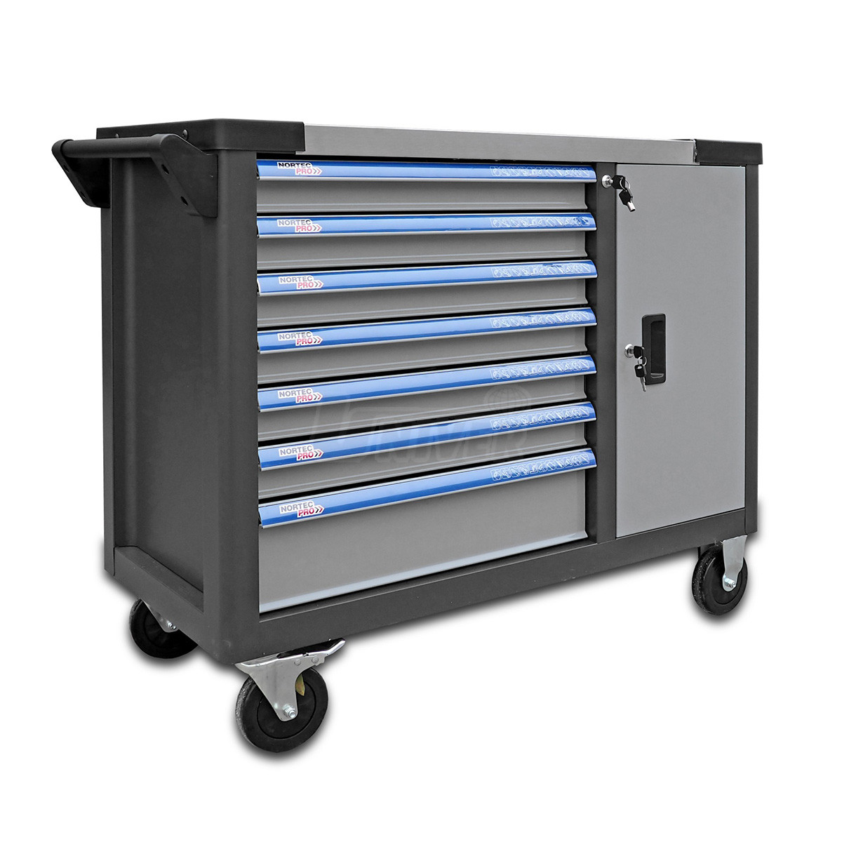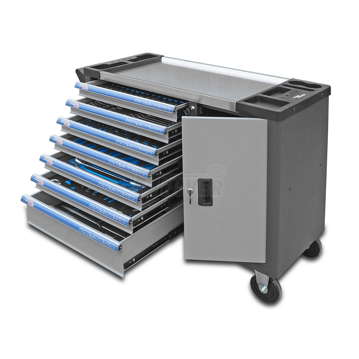 Dílenský montážní vozík s ručním nářadím (140 ks), se 7 zásuvkami (6 nízkých a 1 vysoká) a s boční skříňkou s dvířky.- masivní celokovová konstrukce pro náročné provozní nasazení