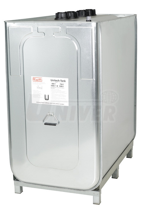 1000 l ocelový plech, žárově zinkovaný HDPE (polyetylén vysoké hustoty) 4 x G 2" vnitřní, sudové šroubení 1280 x 760 x 1420 110 kg |