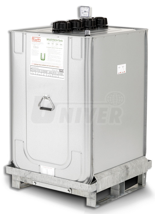 400 l ocelový plech, žárově zinkovaný HDPE (polyetylén vysoké hustoty) 4 x G 2" vnitřní, sudové šroubení 730 x 700 x 1180 55 kg |