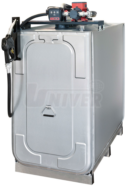 Dvouplášťová nádrž (vnější plášť ocelový, žárově zinkovaný, vnitřní plášť HDPE) na naftu a LTO o objemu 1000 l s elektrickým čerpadlem 230 V, automatickou výdejní pistolí a průtokoměrem.