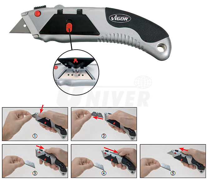 Univerzální nůž má aluminiové těleso a výměnnou čepel. Výměna je snadná a rychlá (funkce rychlovýměny čepele). Čepel je zhotovena ze speciální oceli. Dodává se s 10 ks výměnných čepelí.<