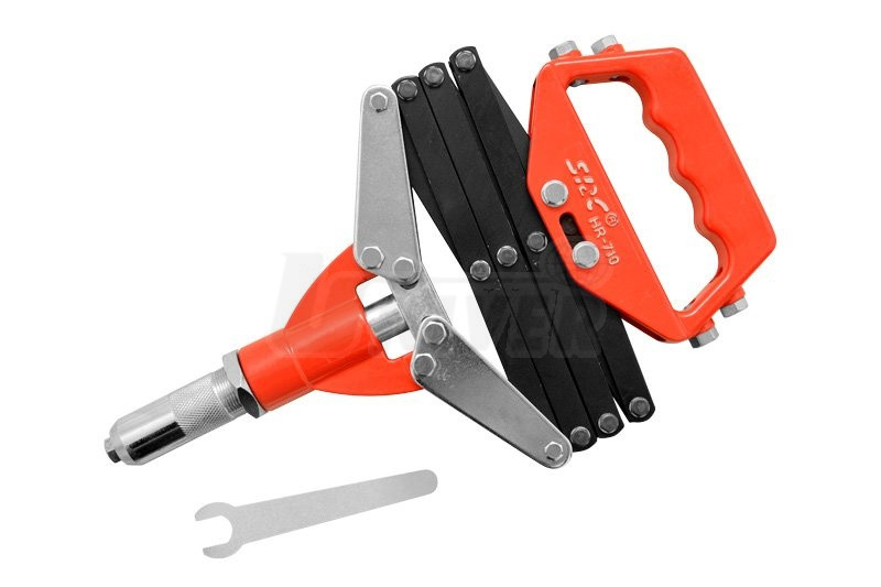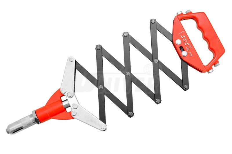 Jednoruční nůžkové / harmonikové kleště pro nýtování standardními trhacími nýty Ø 3,2 mm, 4,0 mm, 4,8 mm, 6,0 mm a 6,4 mm ze všech běžných materiálů (zejména hliník, ocel a nerezová ocel).Kleště mají skříň ze speciální tlakové aluminiové slitiny v kombinaci s kovanou ocelí, kvalitní práškovou povrchovou úpravu, 5 vyměnitelných vložek (pouzder) pro různé průměry nýtů a klíč k nim. Tyto nýtovací kleště jsou vybaveny nůžkovým/harmonikovým uspořádáním páky se čtyřnásobným uložením převodu, což značně snižuje nároky na velikost síly při nýtování.
