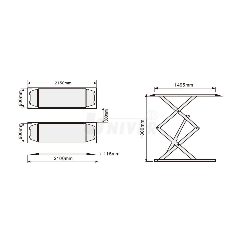 dva spodné rámy, tzv. konštrukcia (dvojitého) nožnicového výťahu s 2 hydraulickými jednotkami/valcami, dvoma nosnými plošinami a samostatnou ovládacou skriňou
