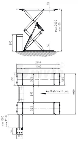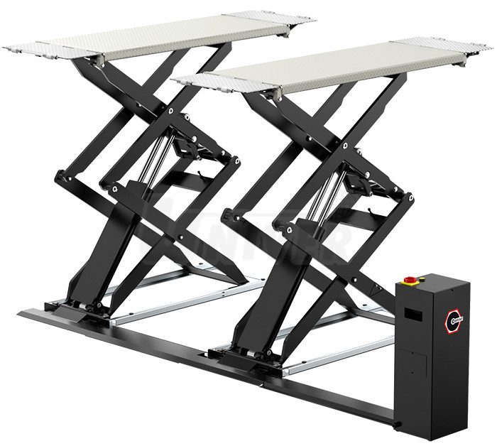 (Dvoj)nůžkový elektrohydraulický zvedák (3,5 t) s délkově nastavitelnými plošinami a žárově pozinkovaným podlahovým rámem.- instalace na podlahu nebo v úrovni s podlahou