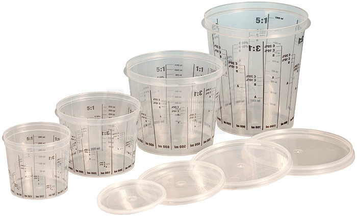 Transparentní odměrné kelímky se používají na míchání barev v různých míchacích poměrech.- dodávají se ve 4 objemech
