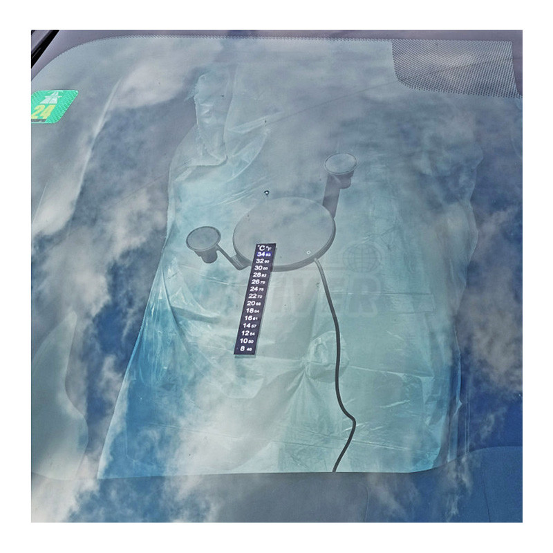 Ohrievač miesta opravy čelného skla napájaný cez USB adaptérom na 12 V zapaľovač cigariet alebo 230 V sieť. 5x prúžkový teplomer (VBSA 961).