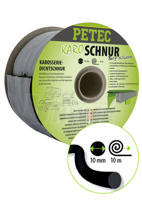Samolepicí, trvale pružná, těsnicí karosářská šňůra Ø 10 mm na butylkaučukové bázi pro dlouhodobé utěsnění spár, dutin a přeplátování zejména na karosériích.- těsnění spár, dutin, falců, svárů, přeplátovaných plechů karoserií a další plechových dílů (např. blatníků, zadních světel, kabelových prostupů, střešních oken, ochranných a ozdobných lišt, světlometů, brzdových a zpětných světel, spojlerů, dveřních čalounění apod.) proti vlhkosti, prachu a průvanu