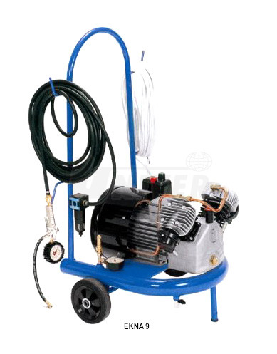 - kompresor EKN 9 je vybaven přívodním kabelem a tlakovou hadicí s hustičem pneumatik, je zkonstruován zejména pro pneuservisy a vybaven odlučovačem vody