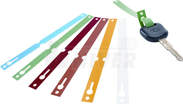 - tenký (0,2 mm) plastový pásek (HDPE odolný proti přetržení) o rozměru 160 x 12,7 mm se 2 otvory na koncích a s jedním větším otvorem s protažením, průvlekem přes tento větší otvor a kroužek klíče se získá jednoduchá, levná, ale velmi pevná visačka na klíče s jednorázovým použitím