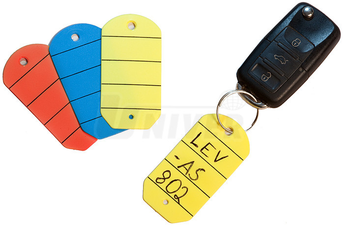 - jednostranný silnější plastový identifikační štítek o rozměru 35 x 70 mm s větším otvorem v horní části a menším/průvlečným v dolní části, do tohoto menšího otvoru se zavěsí kroužek s klíčem