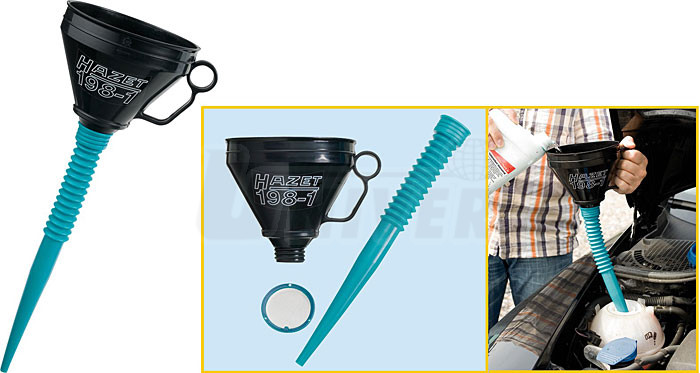 Plastový trychtýř s vymontovatelným sítkem má držadlo a odšroubovatelný spodní výtokový nástavec v pružném provedení. Používá se pro plnění všech běžných provozních kapalin (oleje, palivo, brzdová kapalina atd.). Trychtýř je z odolného polypropylénu, hadice/pružný výtok z polyetylénu a sítko z ušlechtilé oceli. Trychtýř má průměr 165 mm, délka trychtýře i s našroubovaným výtokem činí 480 mm.