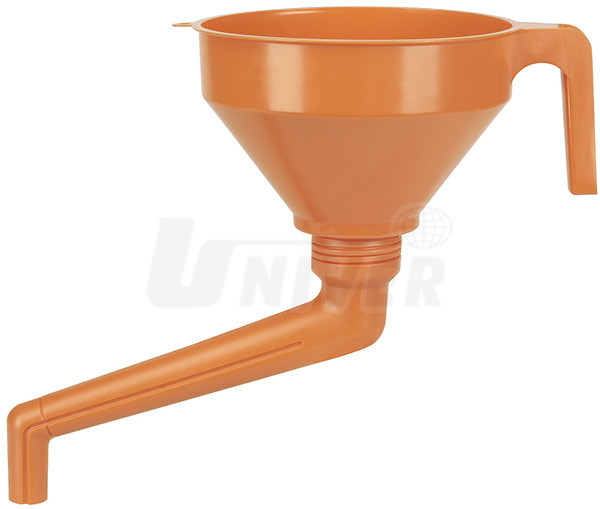 Kvalitní kombinovaný plastový trychtýř s vyšším límcem, vyměnitelným jemným mosazným sítkem, držadlem, se závěsným očkem a odšroubovatelným úhlovým výtokovým nástavcem. Dobře odolává olejům, kyselinám, pohonným hmotám a prasknutí.Použití: průmysl, opravárenství, řemeslná výroba, dílny apod.