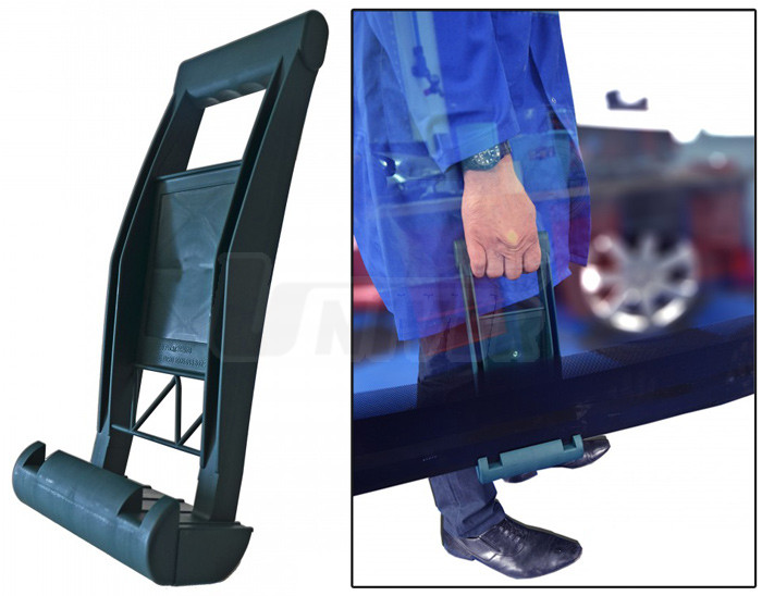 Praktický nosič skel z vyztuženého plastu umožňuje přenášení skel jen jednou osobou bez použití přísavek.
