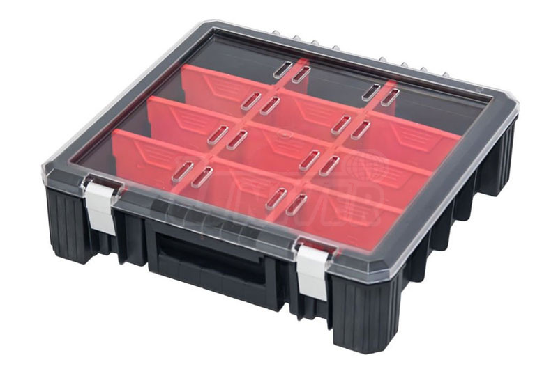 Profesionální plastový organizér se zvýšenou odolností s 12 přestavitelnými přihrádkami s průhledným víkem a s integrovaným držadlem.- profesionální organizér s přestavitelnými plastovými přepážkami